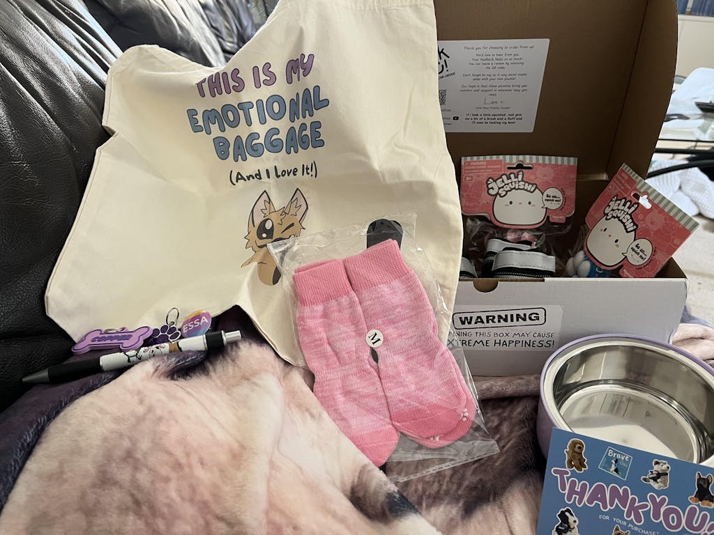 The package came so quickly and was in great shape. I got a few other things other than the tote bag including, Jelli Squishi’s, the custom name tag and paw tag, LPP pen, ESSA pin, socks and boots, and the pet bowl and I love every single one of them! Everything is such great quality and if you have any doubts (or not) about whether you want to buy from Little Paws Plushies, I highly recommend! Plus customer service is excellent. And as other reviews have said, opening the box did indeed cause extreme happiness! My other ESSA absolutely loved it. Thank you so much Little Paws Plushies and Lisa for everything and for making such an amazing business!