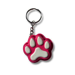 Pink paw-shaped keychain on a white background