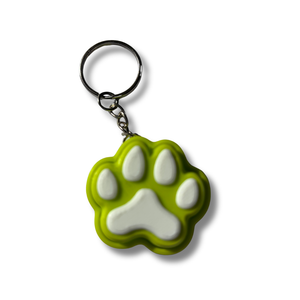 Green and gray paw-shaped keychain on a white background