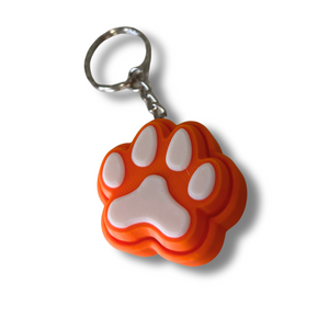 Yellow keychain with a white paw print on a white background