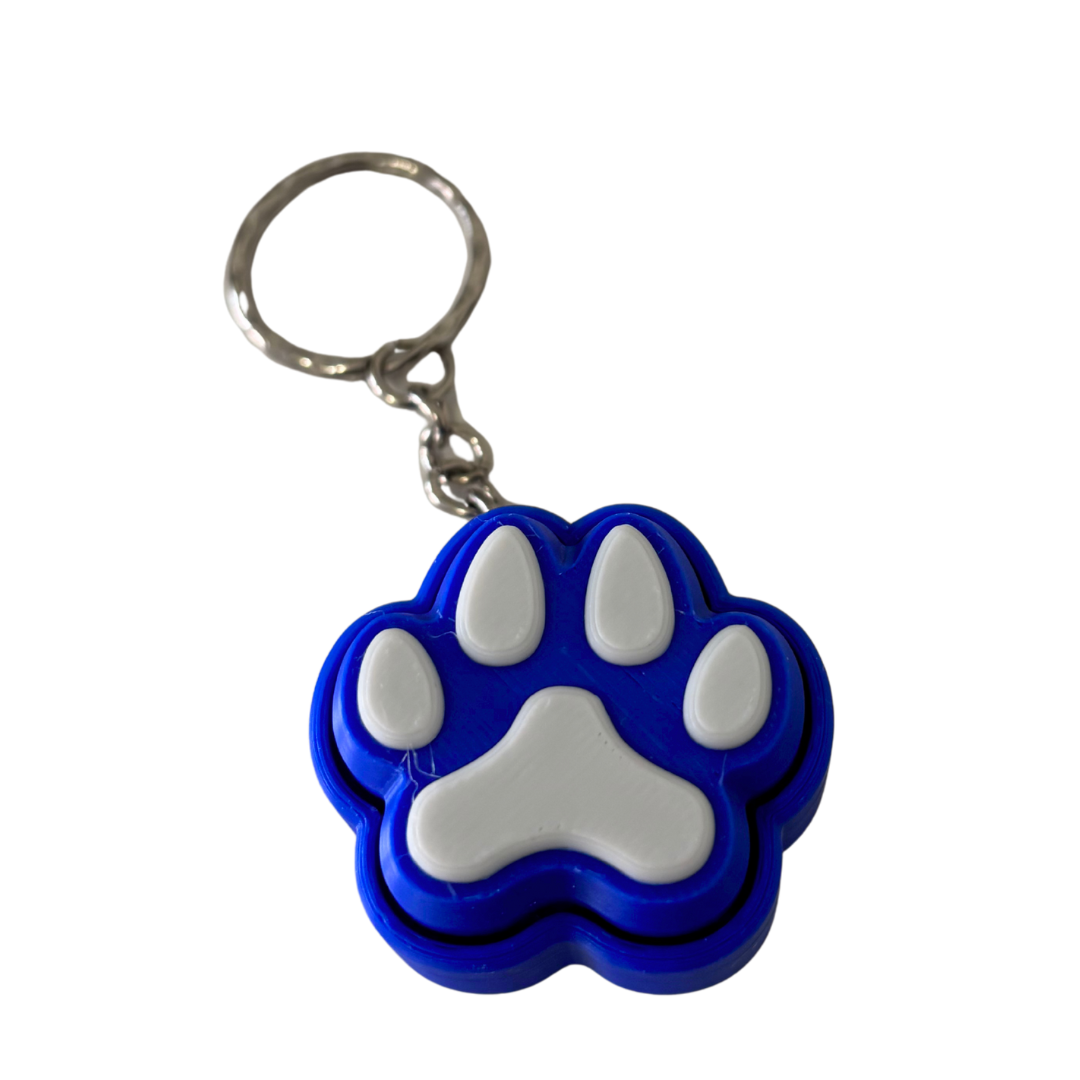 Blue and gray paw-shaped keychain on a white background