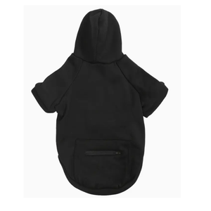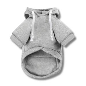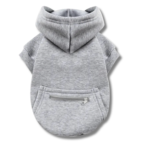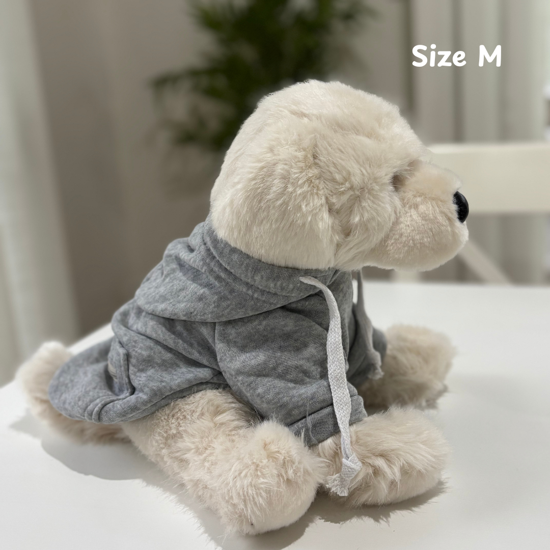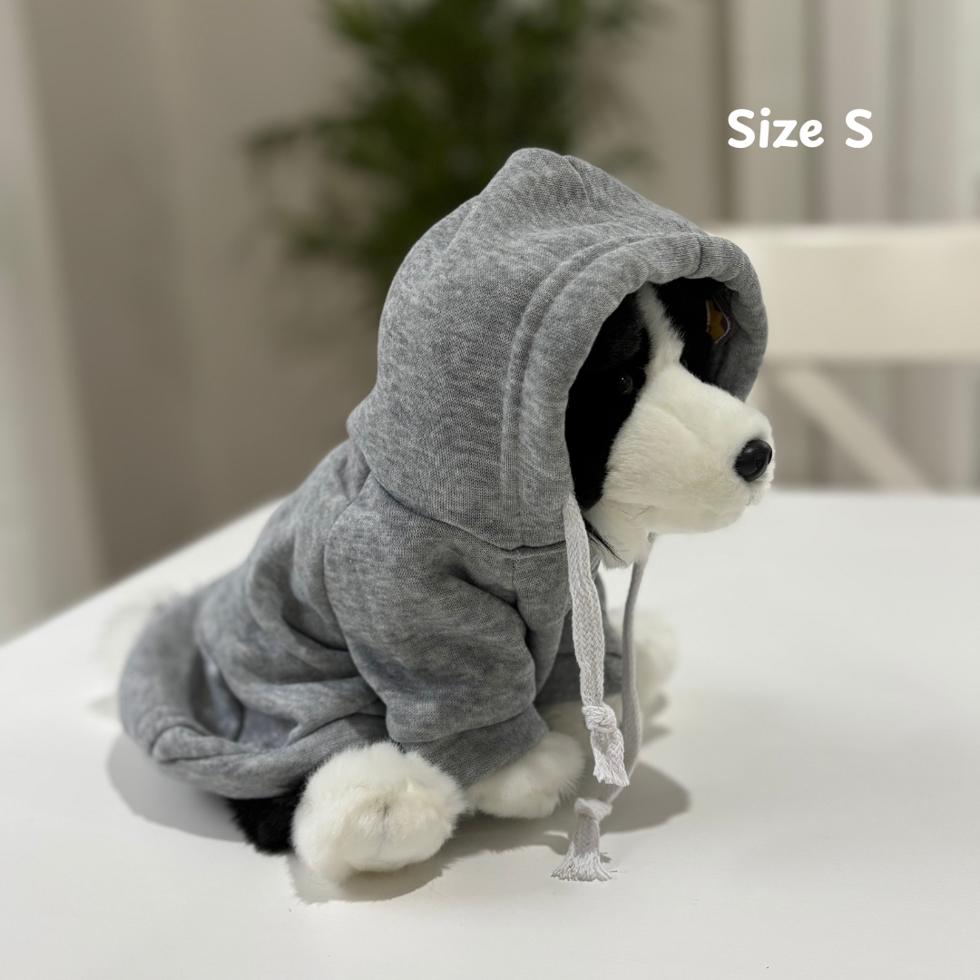 Dog wearing a gray hoodie with 'Size S' text on a light background