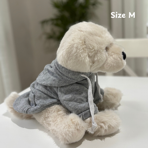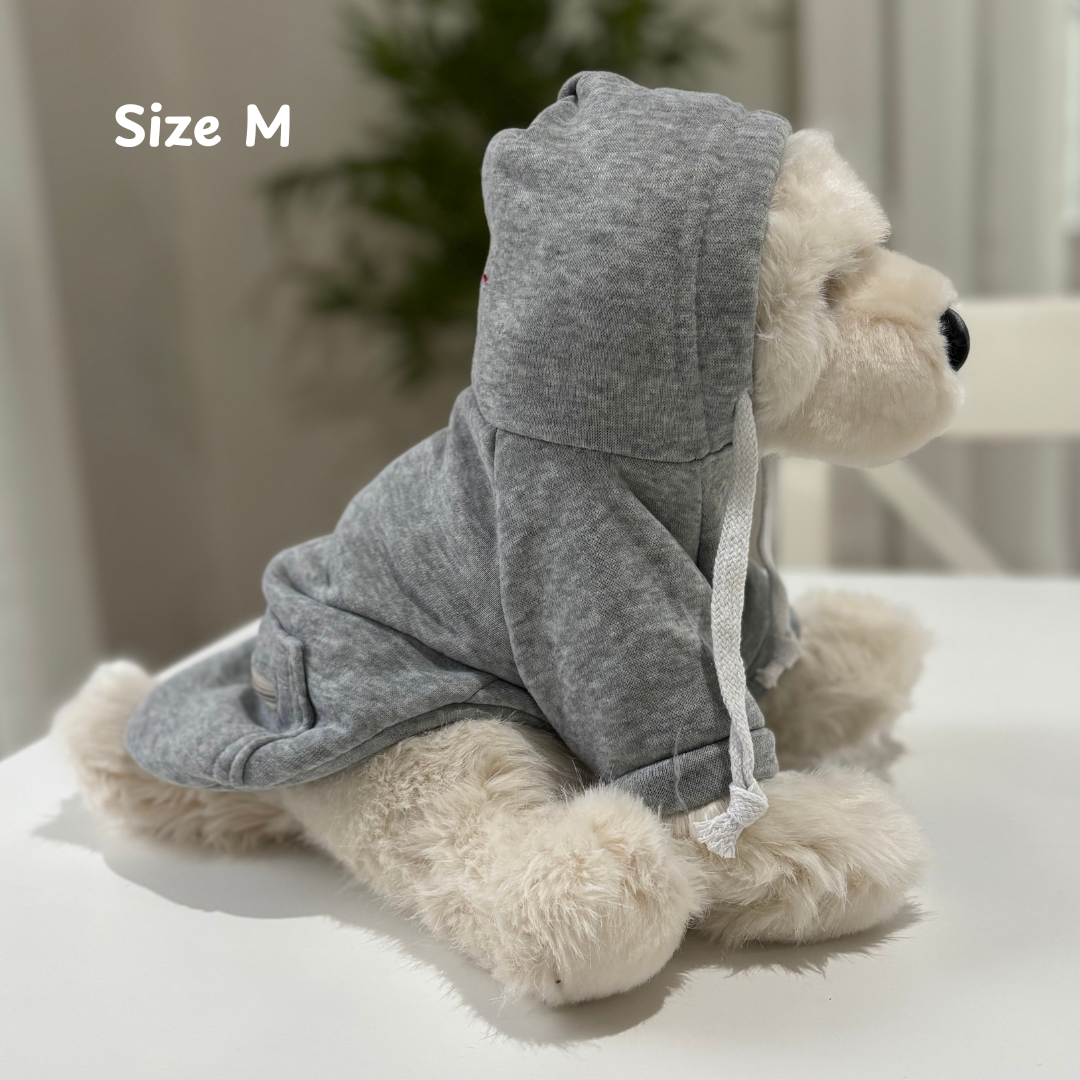 Two stuffed animals in gray hoodies labeled 'Size S' and 'Size M' on a white surface.